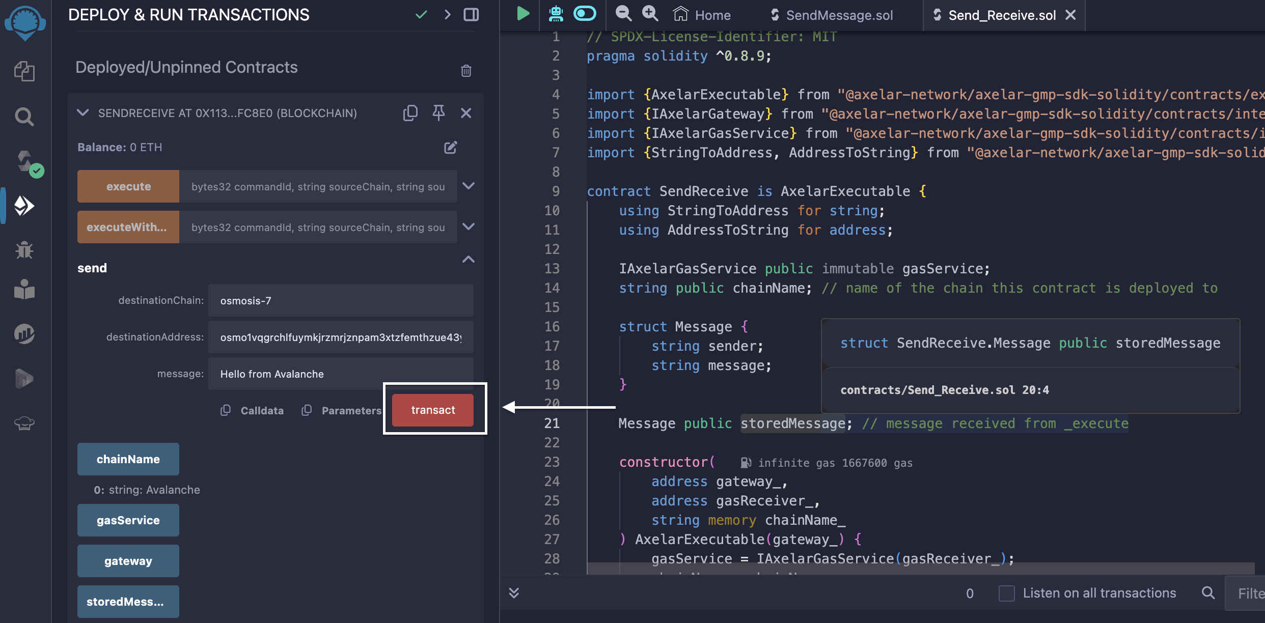 Head back to https://remix.ethereum.org/, find the contract you deployed earlier, and click on the storedMessage button, as shown below. You should see “Hello world from Osmosis!” logged, which indicates that your message was successfully sent from the CosmWasm contract and received on the Avalanche contract.